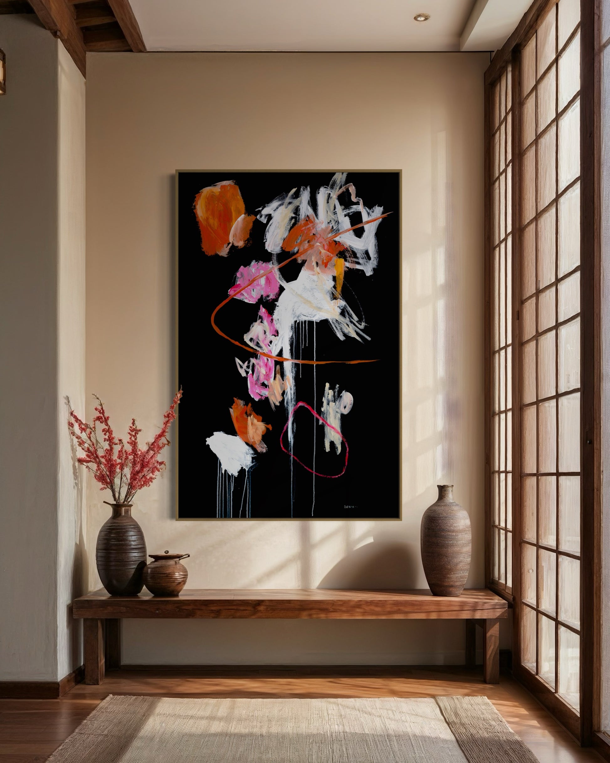 Art print of an original abstract painting originally commissioned for the Four Seasons. Black and bold design that will make your walls pop! Hot pink accents for a modern vibe.