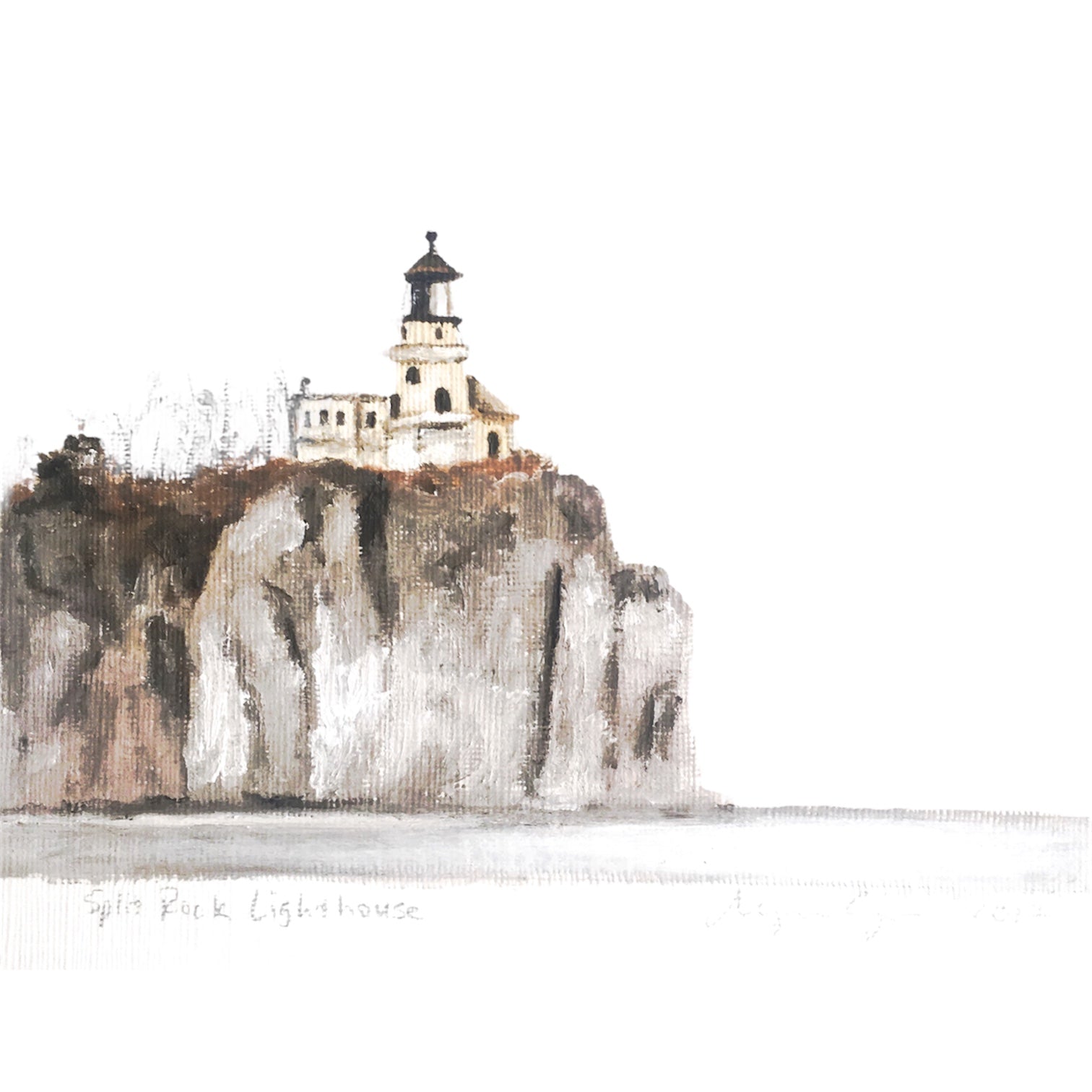 5x7 Art Print on white matte archival paper with 0.25 inch bleed on all sides. This is a print of an original oil painting of Split Rock Lighthouse along the North Shore of Lake Superior on a foggy day, by Minneapolis artist Megan Gonyo.