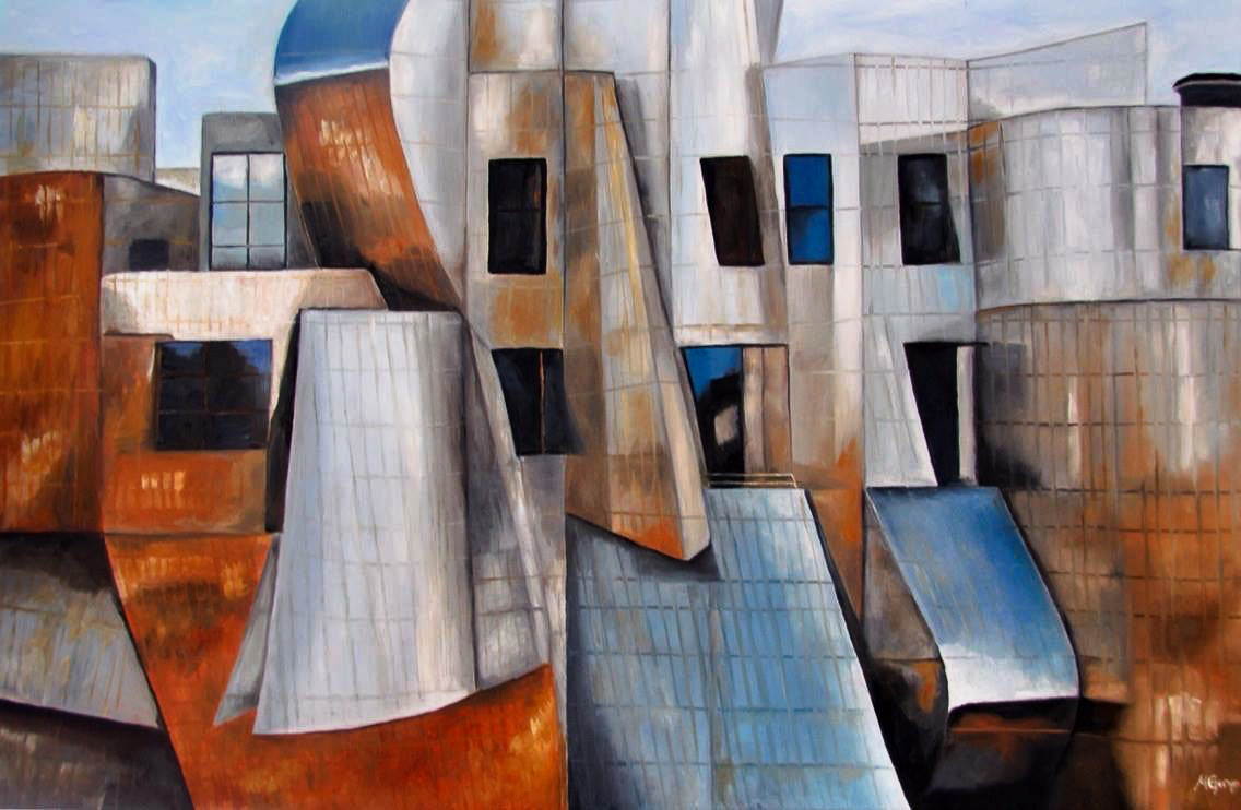 5x7 Art Print on white matte archival paper with 0.25 inch bleed on all sides. This is a print of an original oil painting of the Weisman Art Museum at the University of Minnesota Twin Cities campus in Minneapolis by Megan Gonyo.